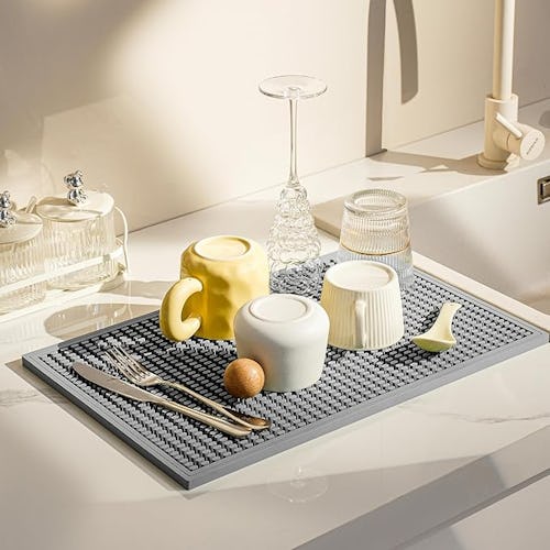 Since these dish-drying mats come in a pack of two, you can use one to catch drips and the other as a giant trivet. They’re heat resistant to 212, making them a safe to place warm pots and pans on them, protecting surfaces. Their clean lines look nicer than a bulky rack, too.