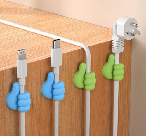 This 12-pack of silly thumb-shaped cord holders keeps cables, accessories, and small household items neatly organized. Each set includes blue, green, and pink clips made from durable, high-quality silicone with a strong nano-adhesive backing that sticks securely without damaging surfaces. The grips hold charging cords, kitchen towels, keys, pens, toothbrushes, and more, making them a truly multipurpose storage solution. Just clean, peel, and stick to install.