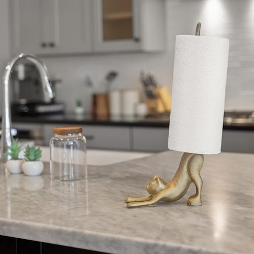 This gold cat paper towel holder is the kind of quirky decor moment that instantly makes your kitchen or bathroom more fun. Made from solid cast iron and hand-brushed for that luxe shimmer, it stands nearly 19 inches tall and arrives fully assembled. It’s sturdy enough for paper towels or toilet paper, doubling as practical storage and bold, whimsical art.
