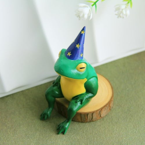 This teeny frog figurine looks like it just hopped in from a fantasy novel, complete with a vibrant purple wizard hat sprinkled with golden stars. Crafted from durable resin and just 3.8 inches tall, the frog is sculpted with lifelike details and a delightfully goofy expression. The compact size makes it perfect to set on a shelf or desk, adding a little magic to your space.