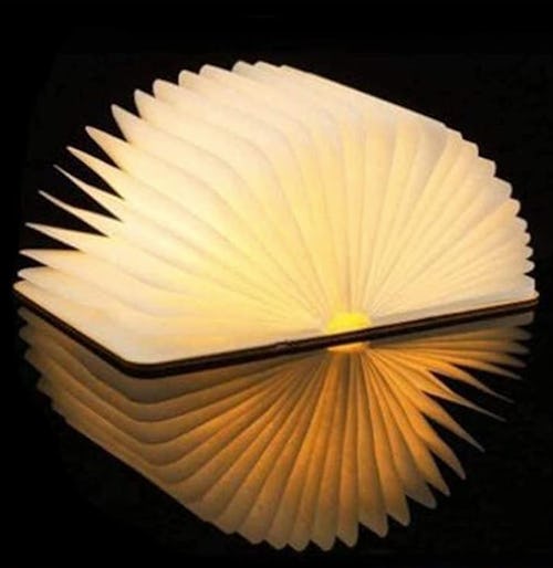 This book lamp looks like a chic hardback, but open it and the pleated paper “pages” light up in three different colors. It folds completely flat for storage, snaps open to a full 360 degrees with its magnetic spine. The lamp runs on a rechargeable battery that lasts up to six hours at a time.