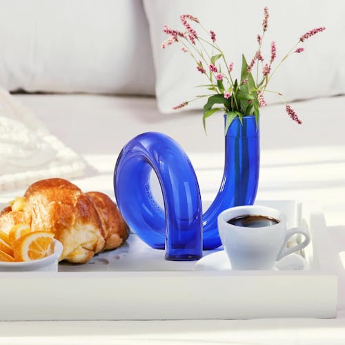 This twisted blue glass vase looks like it was borrowed from a modern art gallery, with its abstract swirl shape and eye-catching color. Mouth-blown from borosilicate glass, each vase is slightly unique. And you can get it in five bright colors to hold your favorite dried florals or greenery stems.
