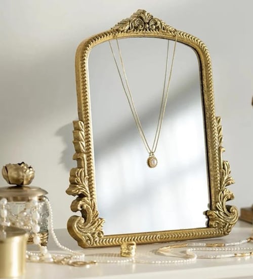 This golden vanity mirror brings a vintage feel with its classic silhouette and ornate detailing. It’s made with high-definition glass for a clear view, and it folds flat so you can even take it traveling. The compact tabletop footprint also make it great for dressers, desks, and vanities. And it comes in silver as well.