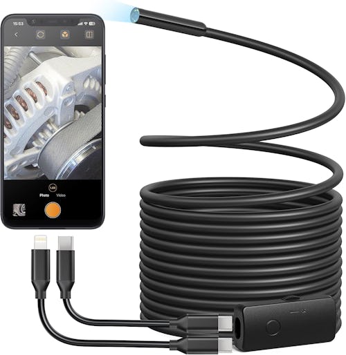 Designed with a plug-in connection to your phone, this endoscope camera gives you a real-time inspection experience. The long 16.5-foot semi‑rigid cable reaches deep into tight spaces without flopping around, and the adjustable LED lights help illuminate dark areas clearly — ideal for plumbing, automotive, or HVAC inspections. The camera connects directly to both Android and iPhone devices (just make sure your phone supports OTG or use the correct adapter).
