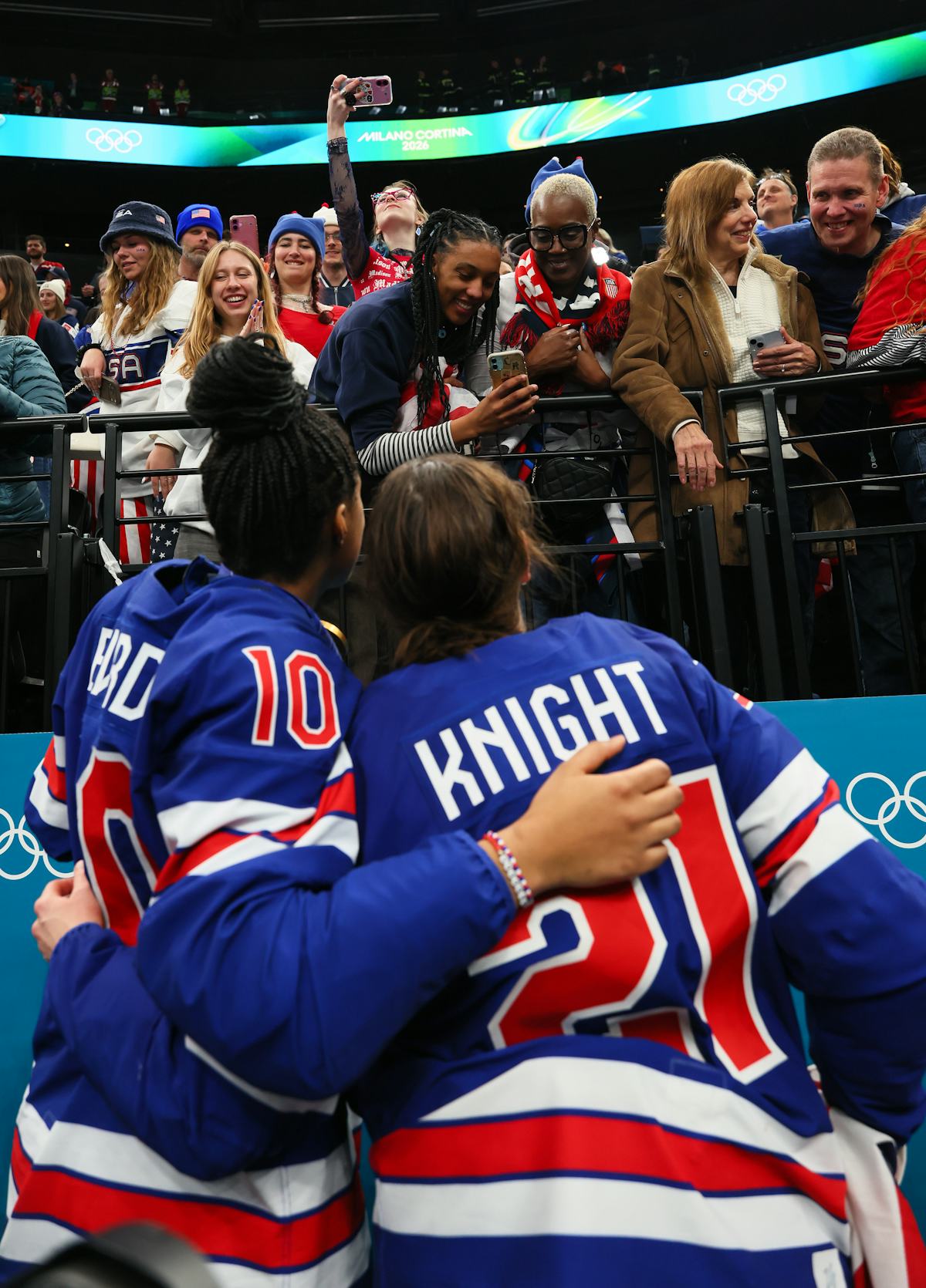 Laila Edwards celebrating being the first Black woman to win Olympic gold for US hockey with her 91-year-old grandmother.