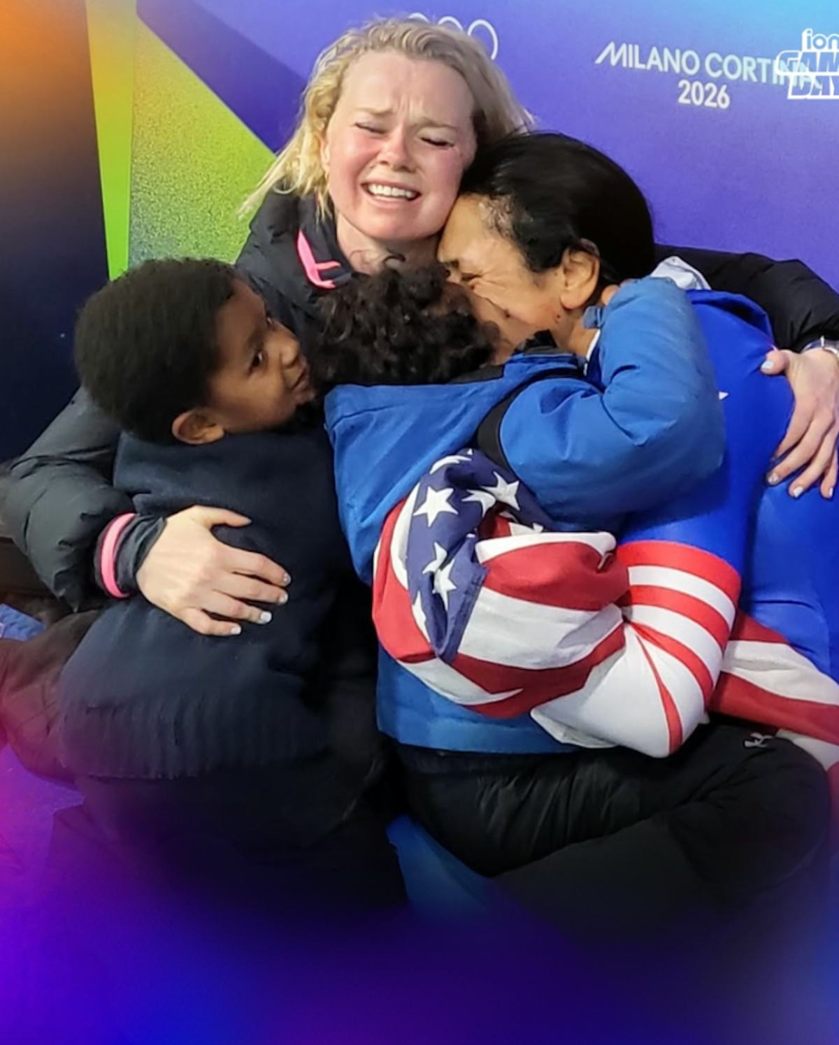 Elena Meyers Taylor hugging her kids and nanny right after winning her first gold medal in her fifth Olympics.