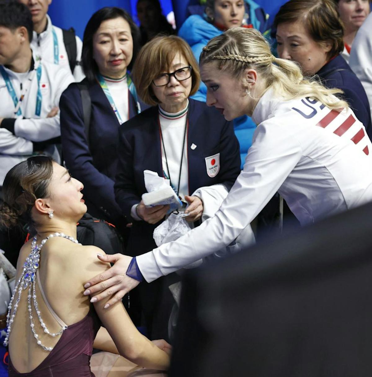 Amber Glenn protecting Kaori Sakamoto from cameras while she recovered from a disappointing performance.