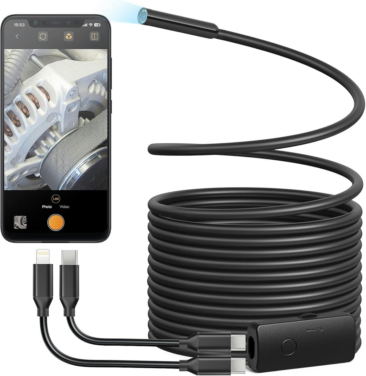 Designed with a plug-in connection to your phone, this endoscope camera gives you a real-time inspection experience. The long 16.5-foot semi‑rigid cable reaches deep into tight spaces without flopping around, and the adjustable LED lights help illuminate dark areas clearly — ideal for plumbing, automotive, or HVAC inspections. The camera connects directly to both Android and iPhone devices (just make sure your phone supports OTG or use the correct adapter).
