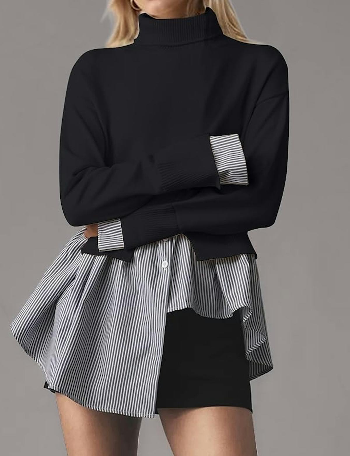 Create a smart layered look without any of the matching guesswork when you grab this modern top. It features a turtleneck sweater with an asymmetrical hem layered over an oversized button-down shirt with a stylish pinstripe pattern. Pair it with a fitted skirt or jeans for an effortlessly chic look.
