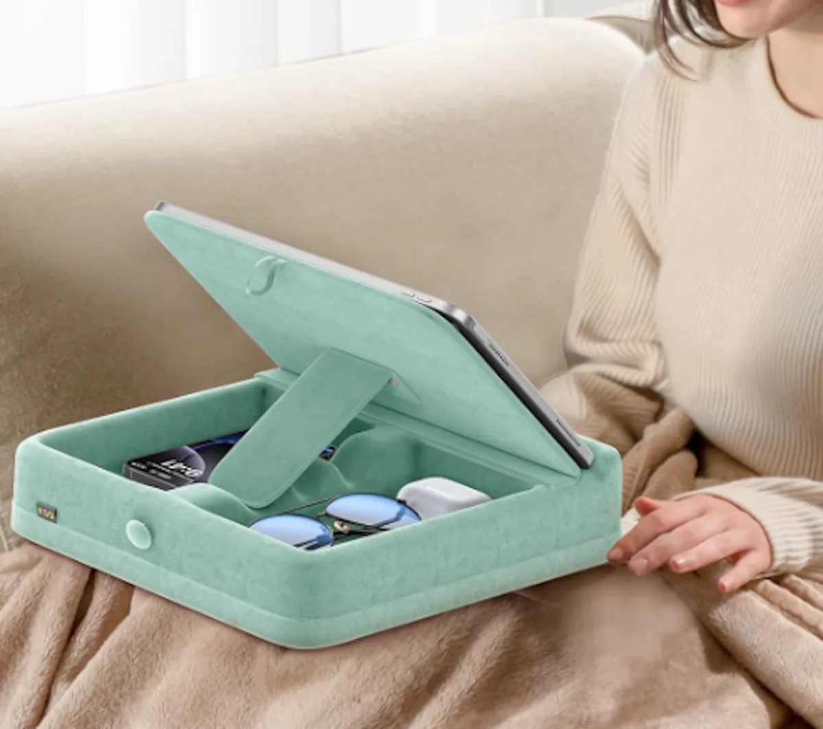 Made for cuddling in bed and streaming your favorite show, this tablet stand offers comfort and functionality. You can prop your tablet up and adjust the tilt multiple angles for hands-free streaming. There’s also a storage compartment inside that is just the right size for keeping essential items close by, as well as two pen holders on the side. And the whole thing is soft and comfortable to use.