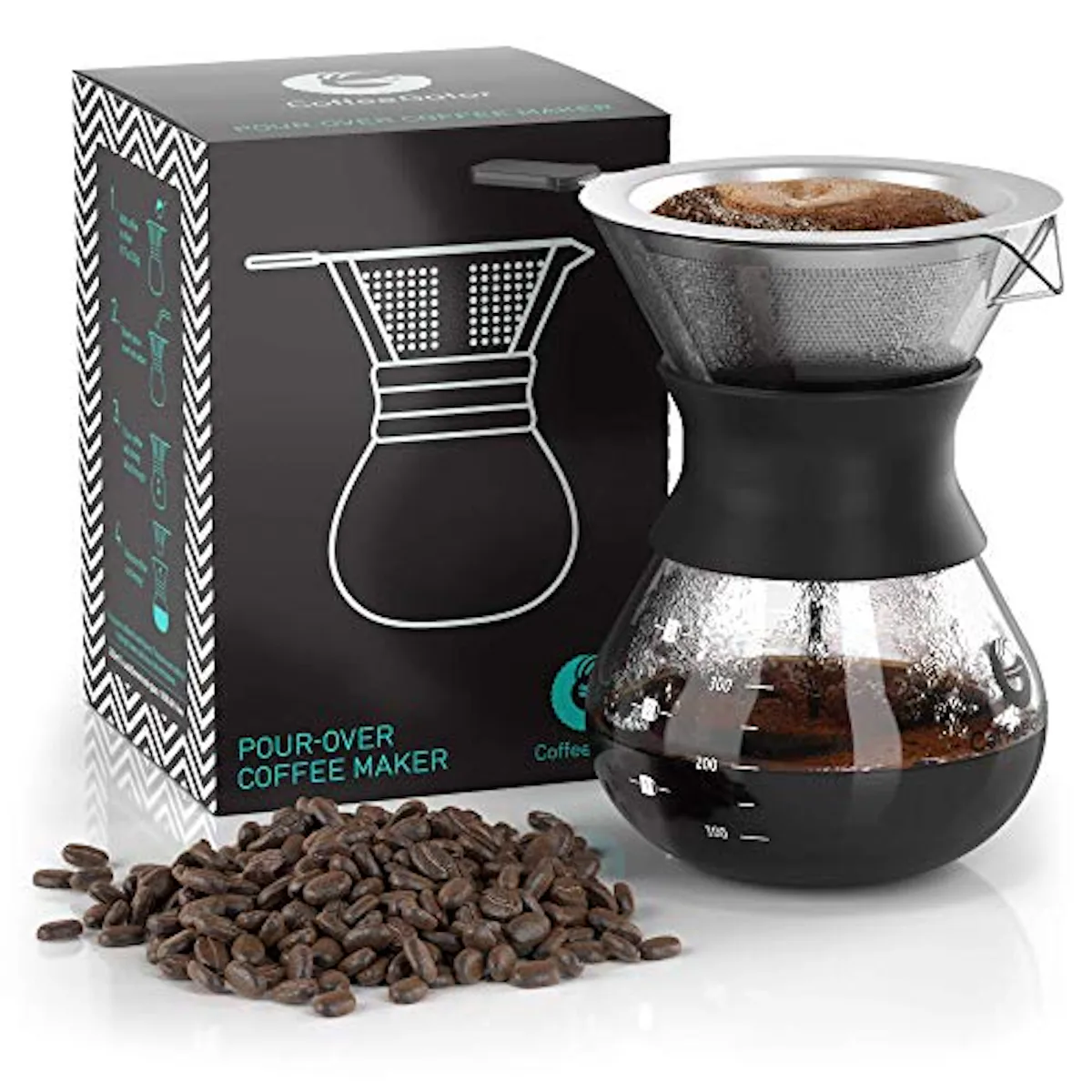 Amazon -Anybody who has high daily brew standards will love this affordable pour-over coffee maker. The stainless steel filter sits securely over cups of different sizes (as well as the included glass carafe), and has a fine mesh design that is perfect, grounds-free cup of Joe. And since it requires no electricity or paper filters, it’s a great find for keeping at the office.