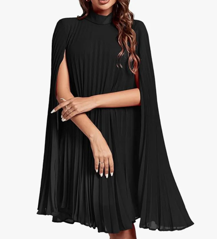 Make an unforgettable entrance in this mock neck cloak. Its floaty fabric swirls around you while you walk. A high neck and slits for your arms make it practical, too. It’s pleated all the way around. Taller wearers will appreciate that it isn’t super short.