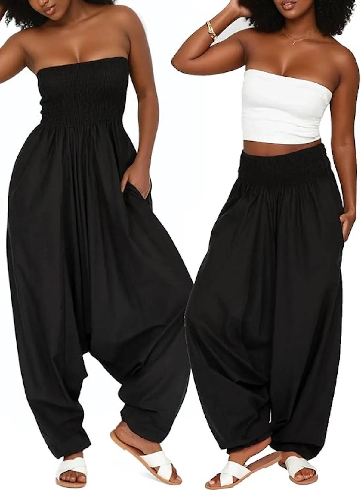 These convertible harem pants are double trouble. Their smocked waist gives you two chic styling options: wear them as regular pants, or pull them up and turn them into a jumpsuit. Their supportive design lets you comfortably go braless. Side pockets make them a practical choice for everyday wear.