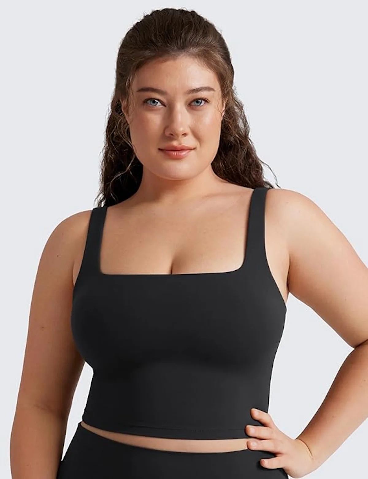 When a sports bra feels like not enough coverage, but a tank is too much, this longline top steps in. It’s designed to hit right around the belly button and features a square neck and thick shoulder straps for extra support. The buttery-soft, moisture-wicking fabric is so comfortable to wear.