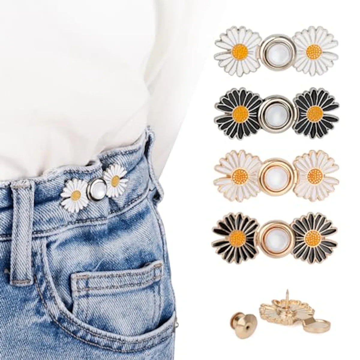 TOOVREN Pant Waist Tightener, Detachable Jean Buttons for Loose Jeans, No Sew and No Tools Button Pins for Jeans, Adjustable Jean Buttons Pins, Daisy Flower Instant Pants Button Tightener 4 Sets