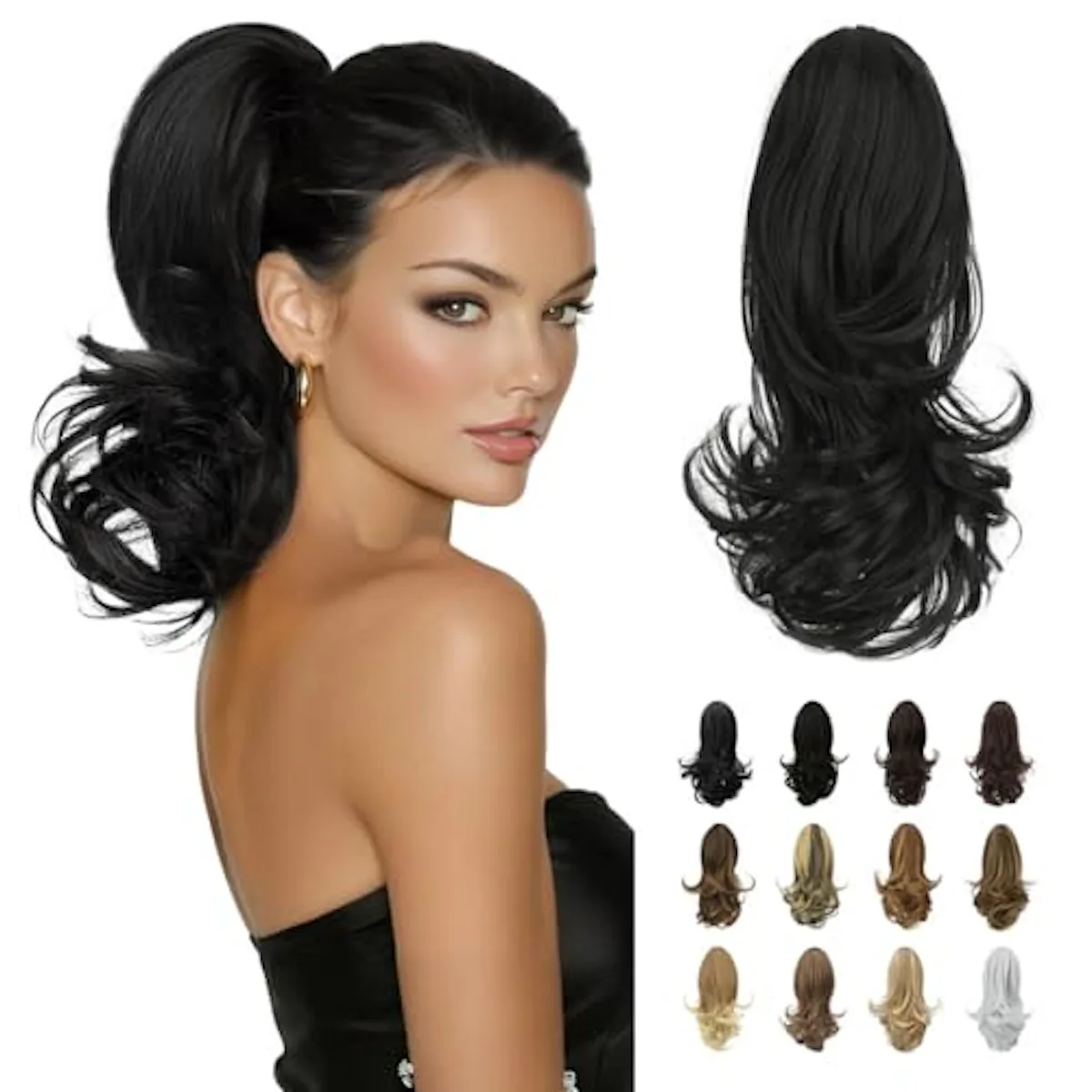 SOFEIYAN 13 Inch Ponytail Extension, Medium Length Wavy Claw Clip Pony Tails Hair Extensions, Lightweight, All-Day Comfort, Natural-Looking Synthetic Hairpiece for Women, Daily Work Use, Black